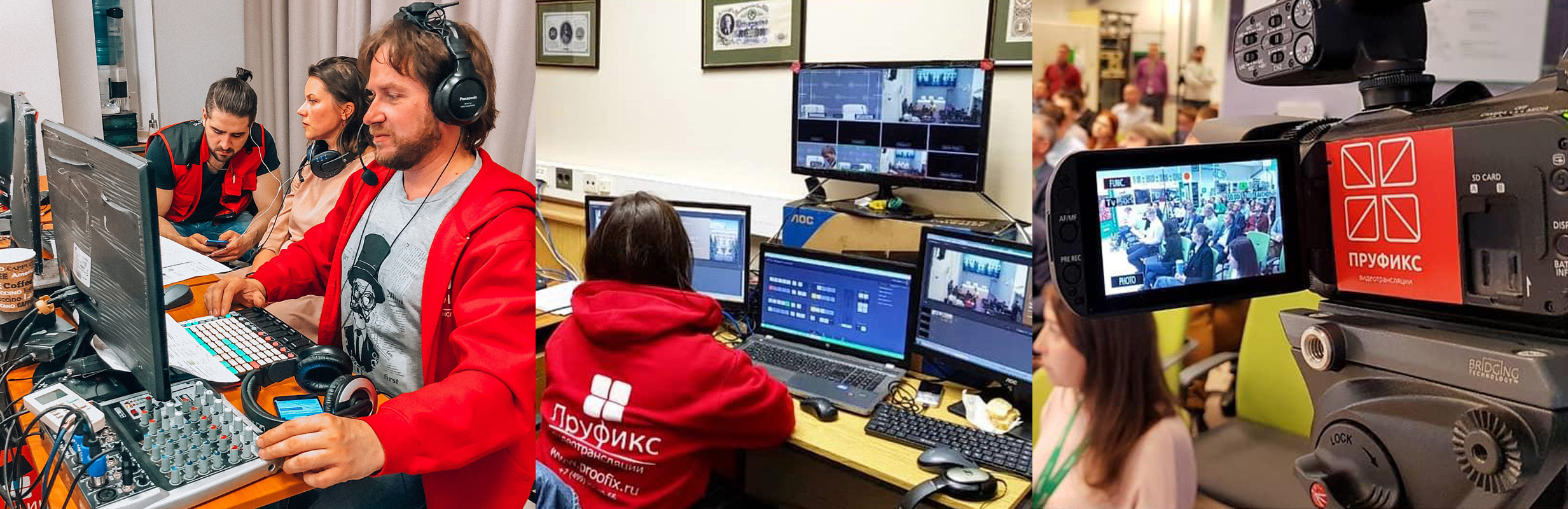 Пруфикс занимается проведением выездных трансляций, онлайн-конференций, телемостов, гибридных мероприятий, вебинаров, онлайн-трансляций с подключением удаленных спикеров из любой точки мира.